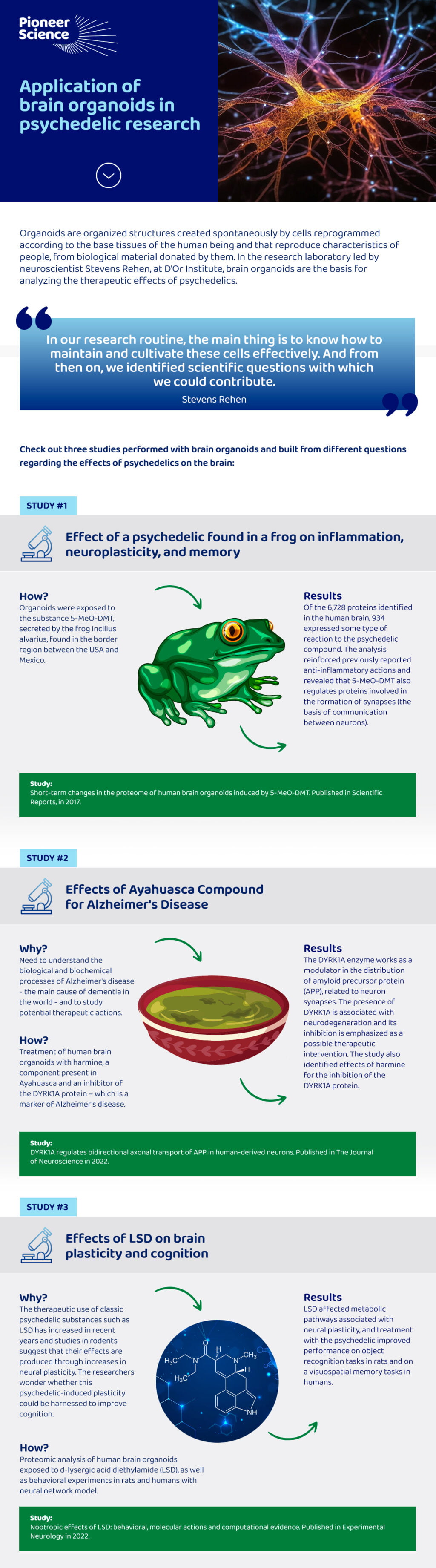 In this infographic, we show how brain organoids can be applied to answer different scientific questions. Three studies developed in the laboratory coordinated by Stevens Rehen, a neuroscientist at D’Or Institute, who studies the effects of psychedelic substances on the brain, are presented.